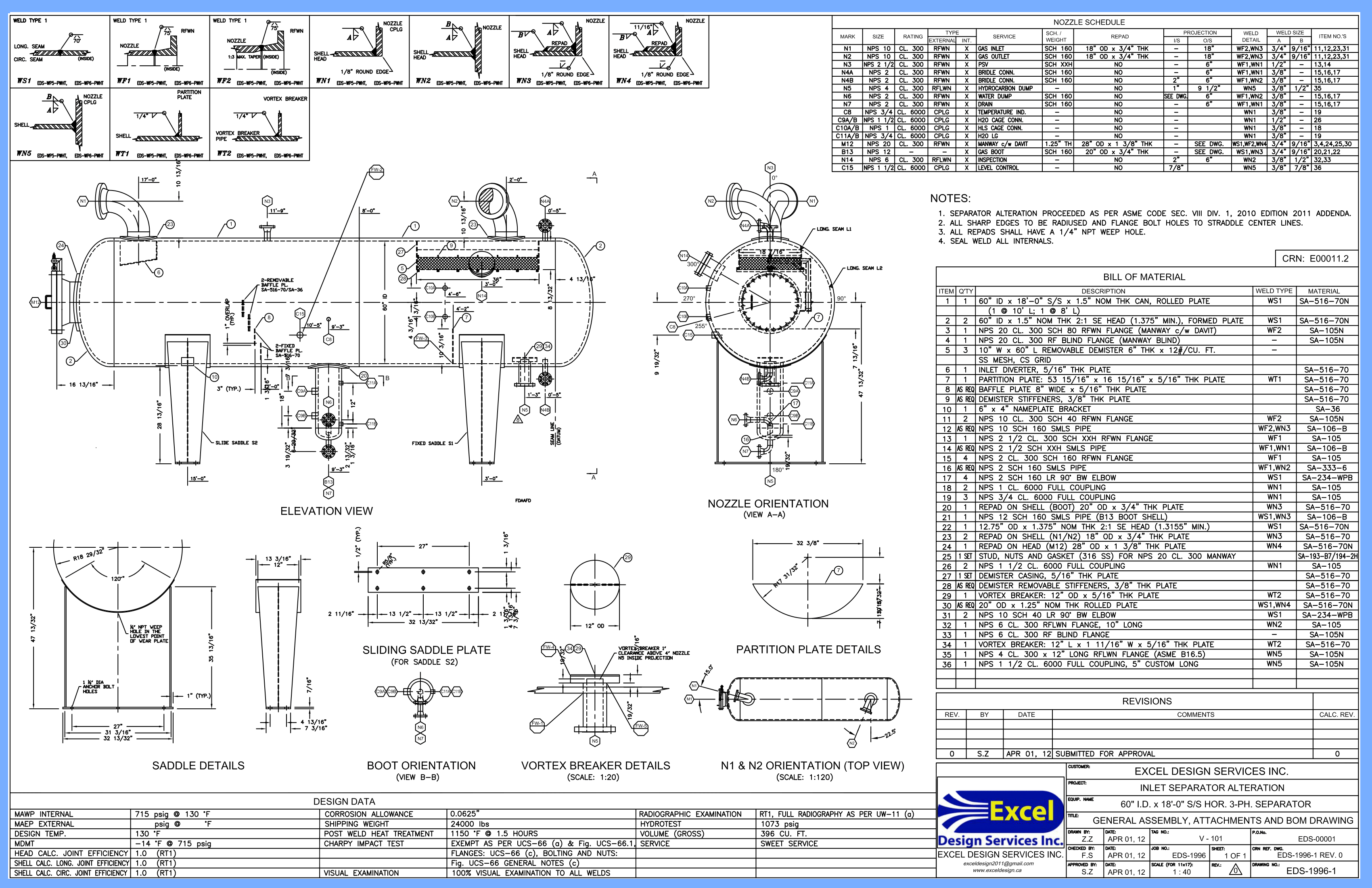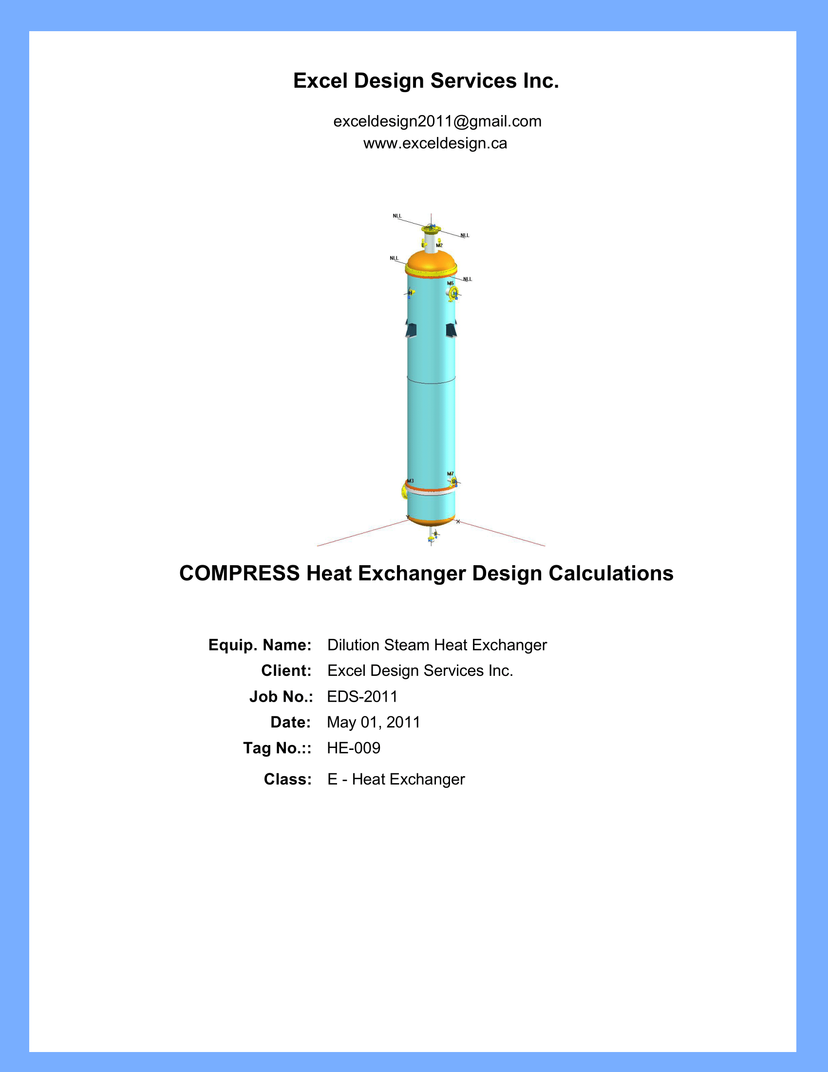 Excel Design Services Inc. utilizes Codeware Compress software or our own flexible Excel calculation spreadsheet to design pressure vessel and heat exchanger as per ASME Sec. VIII Div. 1 & Div. 2, CSA B51, TEMA and client’s design specifications. We use AutoCAD to draft the scaled construction drawings. The regular engineering design process is we submit the engineering design package including design calculations and construction drawings to client for approval after finishing them, and then we submit the design package to Alberta Boilers Safety Association (ABSA) or the safety authorities of other provinces for Canadian Registration Number (CRN) registration after receiving the approval from client. Also, we offer the pressure vessel and heat exchanger re-rate, repair and alteration design calculation and drafting. |